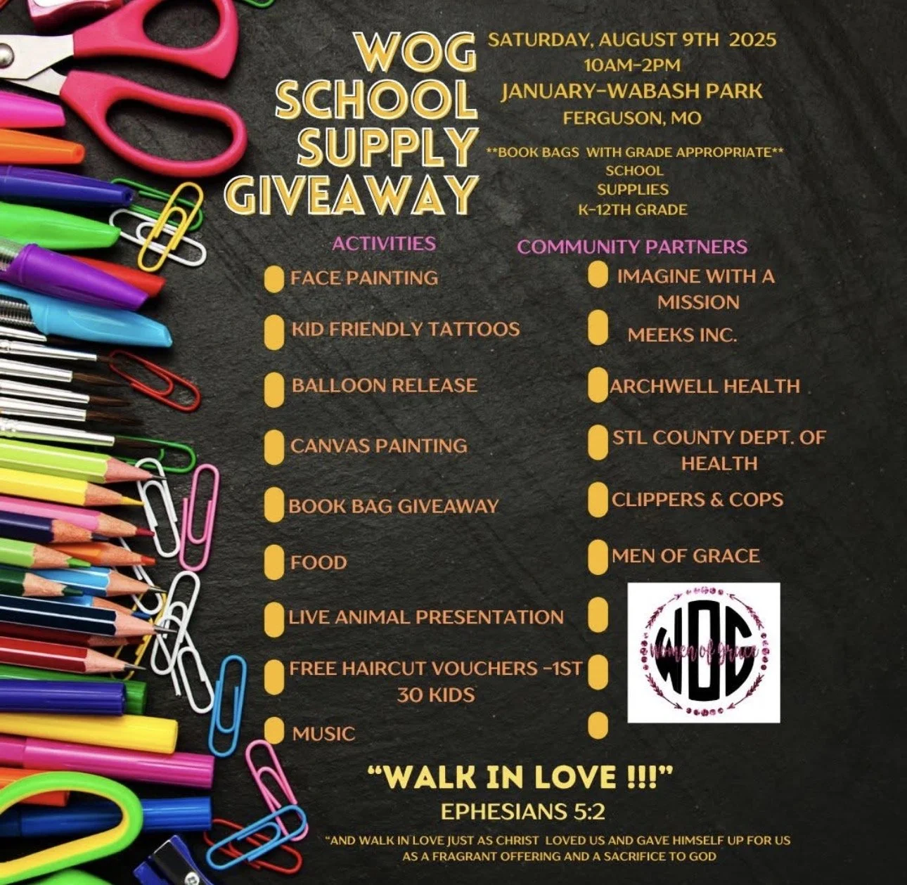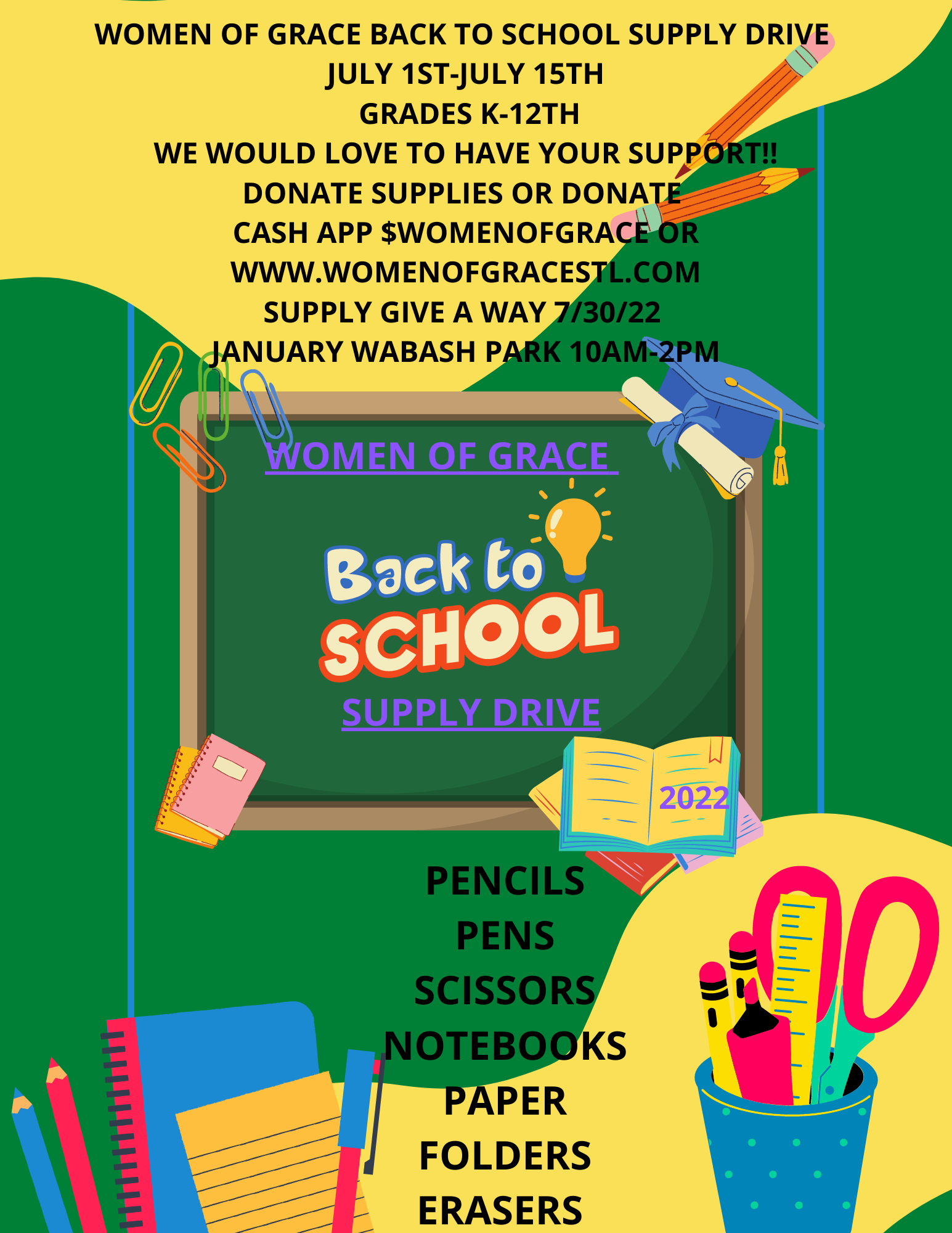 We would love to have to partner with us (Women of Grace Outreach Ministry Inc.) to bless children & families with school supplies!!