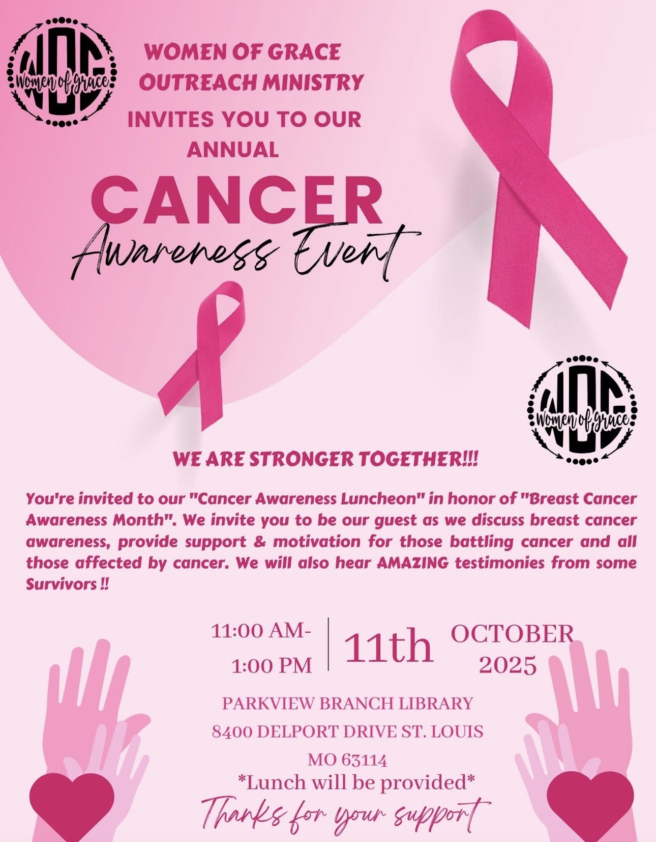 You are invited to our Cancer Awareness luncheon on October 15, 2022 11:00 am to 2:00 pm at the Weber Road Branch Library., 4444 Weber Road, St. Louis MO 63123. We will have an afternoon of fellowship. We will share cancer awareness information and we will hear the powerful testimonies of some survivors. It will be an atmosphere of support for those that are battling cancer, those that have supported those battling cancer and acknowledgement of those that may have transitioned as a result of cancer.